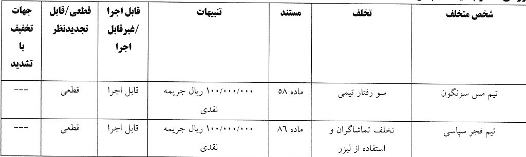 رای تخلفات تیم های مس سونگون و فجر سپاسی به شرح زیر است: