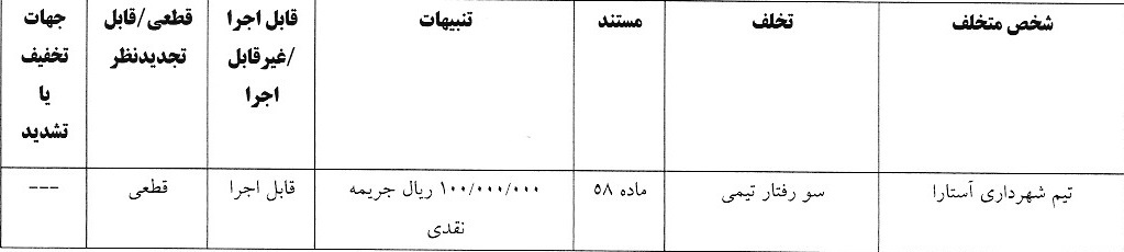 رای تخلف تیم شهرداری آستارا مقابل تیم نیروی زمینی به شرح زیر است: