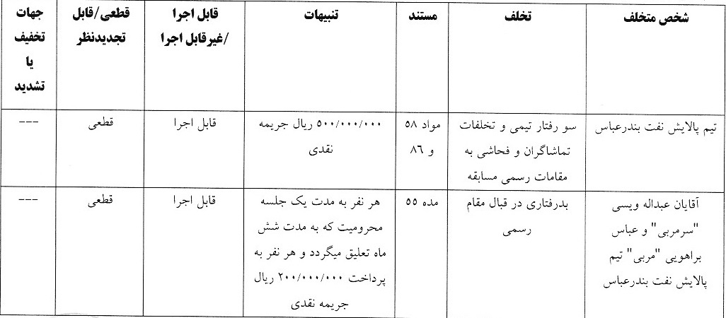رای تخلفات ویسی و تیم پالایش نفت بندرعباس و همچنین شوریده از تیم نیروی زمینی به شرح زیر است: