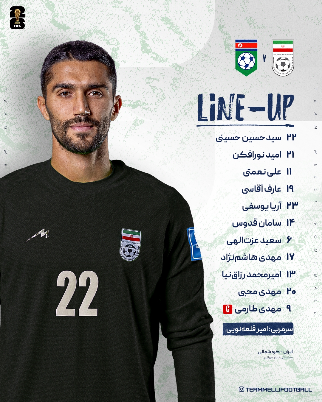 کادرفنی تیم ملی ایران برای بازی امشب تصمیم به استفاده از ترکیب زیر گرفت: